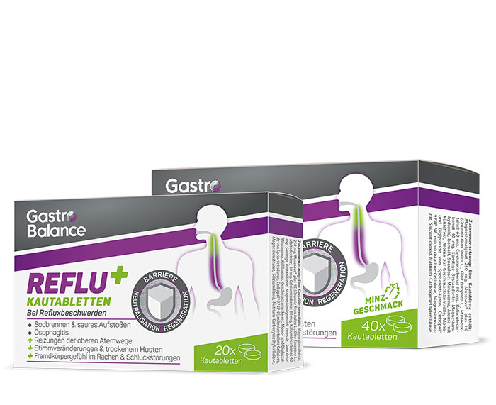 GastroBalance REFLU+ Kautabletten bietet mit seiner umfassenden 4-fach Wirkung eine rasche Linderung der unangenehmen Beschwerden wie zB Sodbrennen, saures Aufstoßen, trockenem Husten, Fremdkörpergefühl im Rachen und Schluckstörungen.